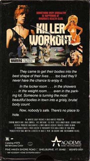 The slasher formula is so simple that it can be imposed on pretty much any setting, from the obvious choices of high schools and sleepovers and creepy houses, to slightly more adventurous locales like coal mines and malls and hospitals and radio stations and the dimly lit alleys of New York. Really, no matter where you set your slasher, the bare minimum you need is a cast of characters so stupid and shallow that the audience can cheer as they get picked off. And when you consider that the stupidest and shallowest people in the world can frequently be found in 1980s-era gyms, you start to see how Killer Workout might not be as much of a shoehorning exercise as it initially sounds.